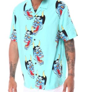 Ed Hardy Devil Face Button Down Camp Shirt Aqua ( S )