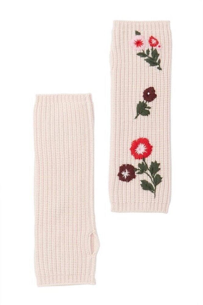Long fingerless gloves are knit from supersoft merino wool with bright, embroidered-flower details for playful, shabby-chic style.