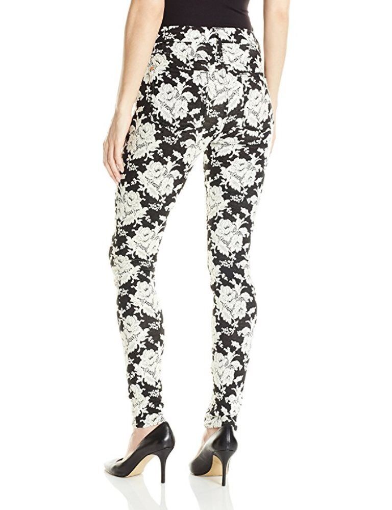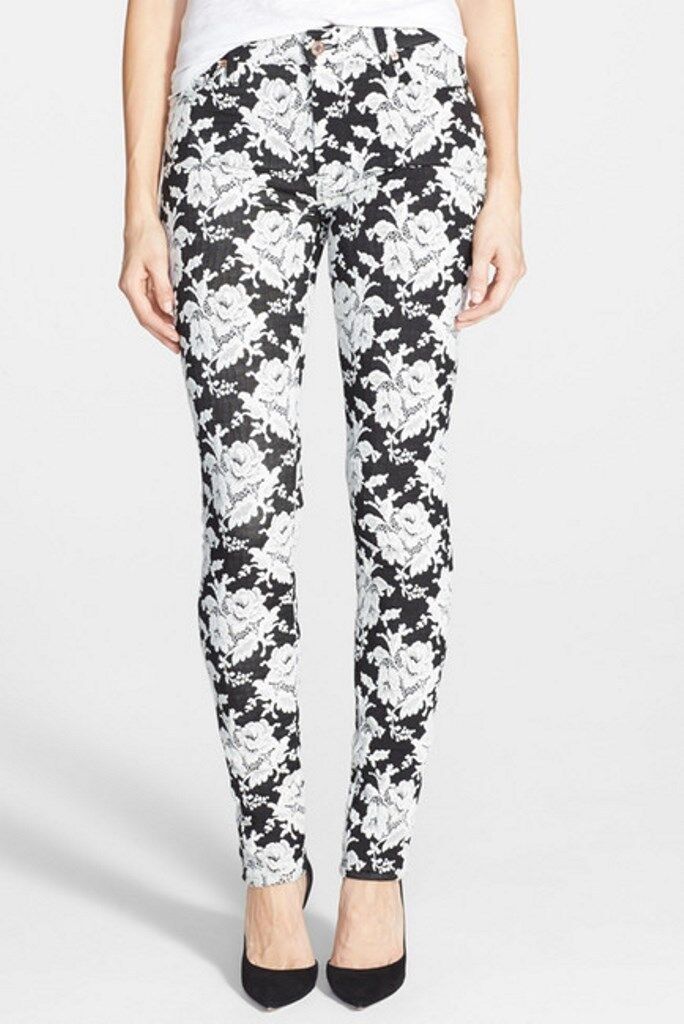 Floral-patterned jacquard lends lovely texture to stretchy black jeans cut in a lithe silhouette.